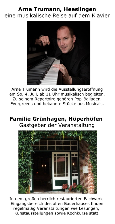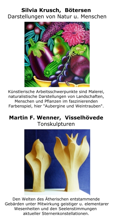 Regionale Künstler geben Einblicke in ihr Schaffen: Der große restaurierte Fachwerk-Eingangsbereich des alten Bauernhauses wird eine Woche lang als Galerie für die regionalen Künstler dienen. Die Malerin Silvia Krusch aus Bötersen zeigt Malerei von Menschen und Pflanzen im faszinierenden Farbenspiel. | ||||||||||||||||||||||||||||||||||||||||||||||||||||||||||||||||||||||||||||||||||||||||||||||||||||||