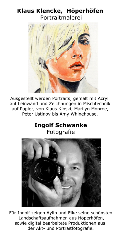| Für den im Mai 2010 verstorbenden Ingolf Schwanke stellen Aylin und Elke seine schönsten Landschaftsfotos aus Höperhöfen, sowie digital bearbeitete Akt- und Portraitfotographie aus. | ||||||||||||||||||||||||||||||||||||||||||||||||||||||||||||||||||||||||||||||||||||||||||||||||||||||