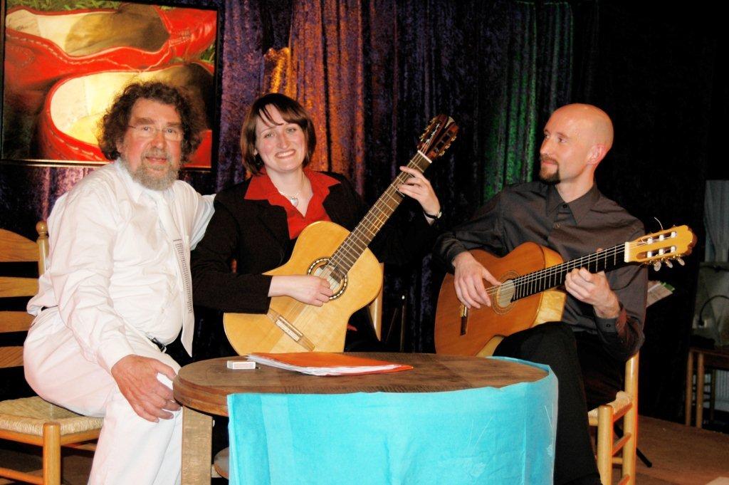 Am Sonntag, den 4 Juli bei "Kunst auf dem Bauernhof" um 16 Uhr Ein facettenreicher Abend steht den Gästen des "Kunst auf dem Bauerhof" am Sonntag, den 4. Juli 2010, bevor: Unter dem Motto Unibunt gibt es Gedichte im Zusammenspiel mit Gitarren im Heimathaus. Beginn ist um 16 Uhr. Der Bötersener Lyriker Hartmut Global und der Musiker Benjamin Faber lernten sich quasi zufällig kennen: Global fiel Fabers Gitarre auf, als sie gemeinsam im Zug saßen und so kamen die Beiden ins Gespräch. Aus der lockeren Unterhaltung entstand eine handfeste Zusammenarbeit: Gemeinsam mit Annette Pfahler, mit der Faber das Duo Hegidinya bildet, stehen sie nun erstmals auf der Bühne. Der eine präsentiert Wortakrobatik, die anderen beiden klassische Gitarrenklänge -gemeinsam nennen sie ihr Programm Unibunt - Gedichte und Gitarren". Meine Texte werden durch die Musik verbunden", berichtet Hartmut Global. Es ist faszinierend, wie sehr beides zusammenpasst." Benjamin Faber belegte gemeinsam mit Annette Pfahler einen Studiengang. Aus dem gemeinsamen Studieren wurde schnell gemeinsames Musizieren und seit zwei Jahren gibt es die beiden Gitarristen im Doppelpack. Die künstlerische Zusammenarbeit nannten sie Hegidinya. Für den Auftritt bereiteten die beiden Musiklehrer Stücke von Musikern wie John Duarte, Maximo Poujol vor und Hartmut Globals Verse musikalisch begleiten. 30 Gedichte werden zu hören sein und frei nach der Überschrift Unibunt" können sich die Besucher auf Lyrisches aus der Natur, aus Afrika, auf Kritisches, Fantastisches und Satirisch-Humorvolles, sowie auf Wortakrobatik im Zusammenspiel mit Gitarrenklängen freuen. | |||||||||||||||||||||||||||||||||||||||||||||||||||||||||||||||||||||||||||||||||||||||||||||||||||