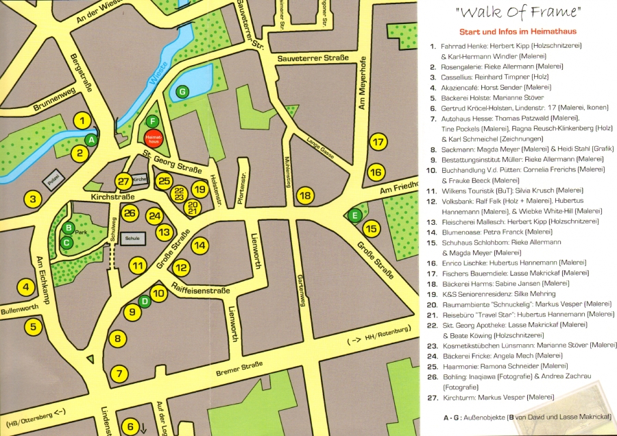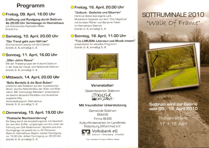 Rundschau Rotenburg, Mittwoch, 3, Februar 2010 Sottruminale kehrt zurück Kulturinitiative plant Ausstellung im ganzen Ortskern Sottrum. Im April wird ganz Sottrum zur Ausstellungsfläche: Die Sottrumer Kulturinitiative ändert ihr Konzept für die Kunstprovinz/Provinzkunst, die, wie vor einigen Jahren, erneut Sottruminale heißen wird, und lädt die Künstler nicht mehr nur ins Sottrumer Heimathaus, sondern in Geschäftsräume im gesamten Sottrumer Ortskern. Die Kulturwoche beginnt am 9. April und soll mit dem Sottrumer Frühjahrsmarkt, am Wochenende 17./18.. April enden. Während dieser Zeit können in rund 30 Sottrumer Geschäften Kunstwerke betrachtet werden. Ein Rundweg führt Interessierte von Ausstellung zu Ausstellung und wird selbst ebenfalls zum Kunstwerk: Skulpturen und Gedichte weisen den Weg. Während Gerd Geiser, der bereits in der Vergangenheit mit seiner Lyrik auf der Kunstprovinz begeisterte, die passenden Worte liefert, werden nach wie vor Künstler gesucht, die Skulpturen und Plastiken für den Kulturpfad zur Verfügung stellen. Im Grunde knüpft das an eine Idee an, die wir einmal hatten, aber finanziell nicht umsetzbar war: Wir wollten an einem ungewöhnlichen Ort mitten in Sottrum das Gedicht der Woche präsentieren", erklärt Kulturini-Vorsitzender Dirk Rademacher. Auf diesem Wege sollte Lyrik auch denjenigen näher gebracht werden, die sonst damit nicht in Berührung kommen. Das wird nun während der Sottruminale erreicht -zudem erhoffen sich die Ver-anstalter, dass durch die ungewöhnlichen Ausstellungsorte ebenfalls Menschen angesprochen werden, die sonst vielleicht nicht feste Besucher der Ausstellung im Heimathaus waren. Darüber hinaus erhoffen wir uns Synergien für beide Seiten - die Künstler und die Geschäftsleute." Letztere waren sofort Feuer und Flamme, als sie von der Idee hörten. Zahlreiche Gewerbetreibende bekundeten Interesse, ihr Geschäft oder ihre Firma als Ausstellungsfläche zur Verfügung zu stellen. Das Interesse war so groß, dass nicht alle berücksichtigt werden konnten. | |||||||||||||||||||||||||||||||||||||||||||||||||||||||||||||||||||||||||||||||||||||||||||||||||||||||